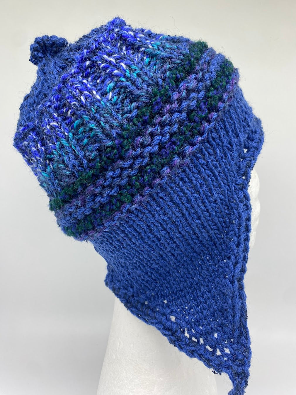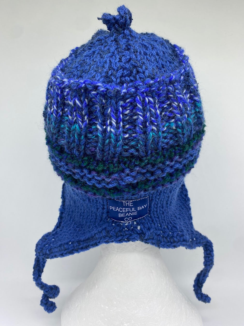A Coastal beanie is created using a 100% Australian wool as its main colour with a mixture of contemporary yarns. It features ear flaps, a band of garter stitch and rib.