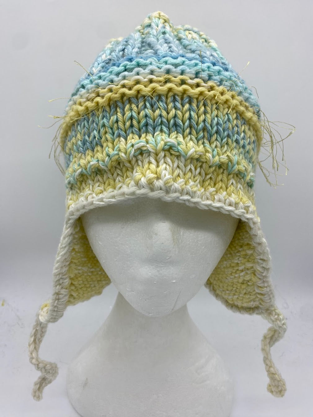 A Coastal beanie is created using a 100% Australian wool as its main colour with a mixture of contemporary yarns. It features ear flaps, a band of garter stitch and rib.