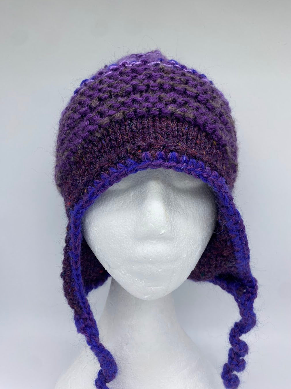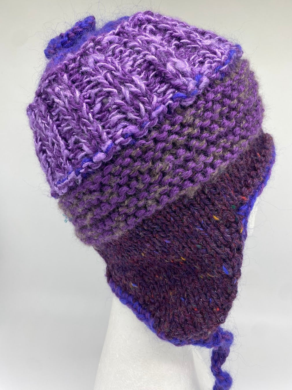 A Coastal beanie is created using a 100% Australian wool as its main colour with a mixture of contemporary yarns. It features ear flaps, a band of garter stitch and rib.