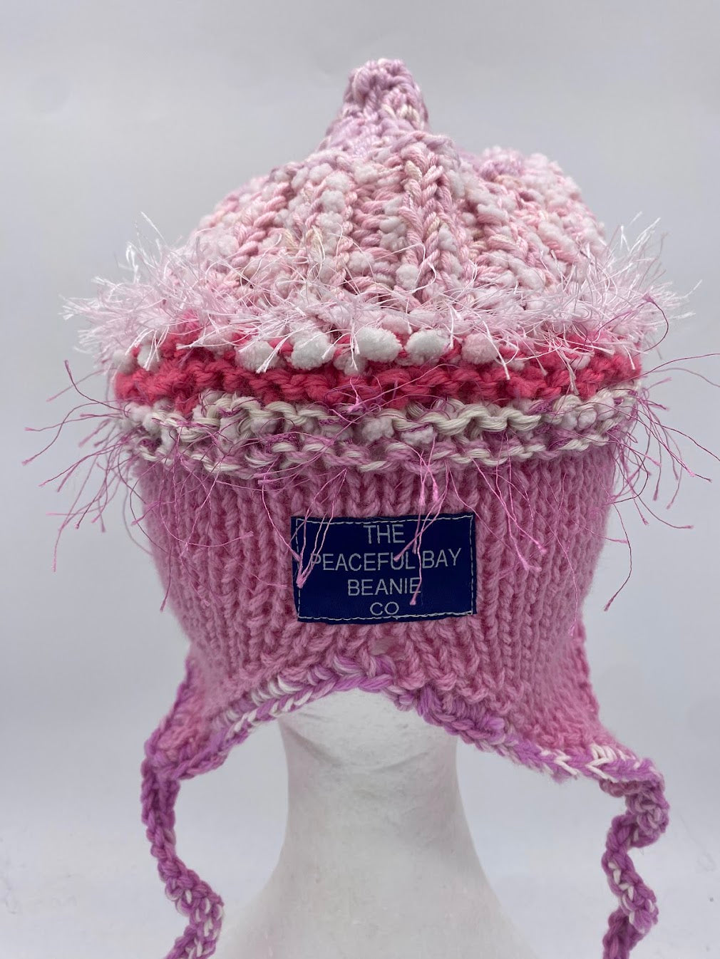 A Foof beanie is created using a 100% Australian wool as its main colour with a mixture of contemporary yarns. It features ear flaps, a band of garter stitch and rib. It has fibres hanging from the crown.