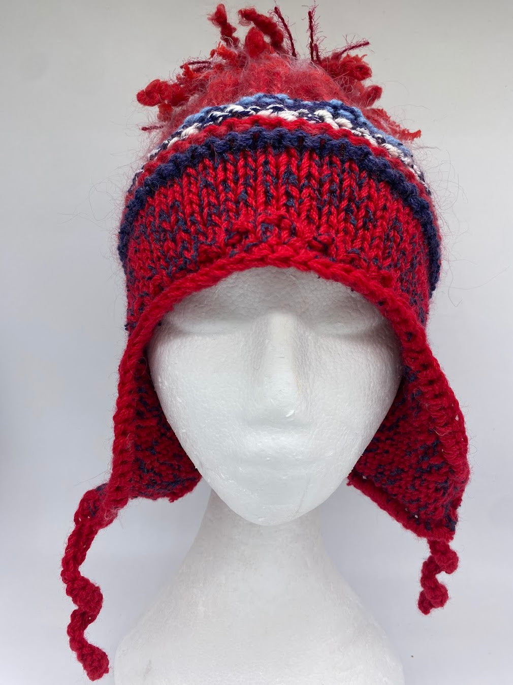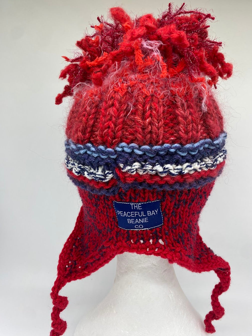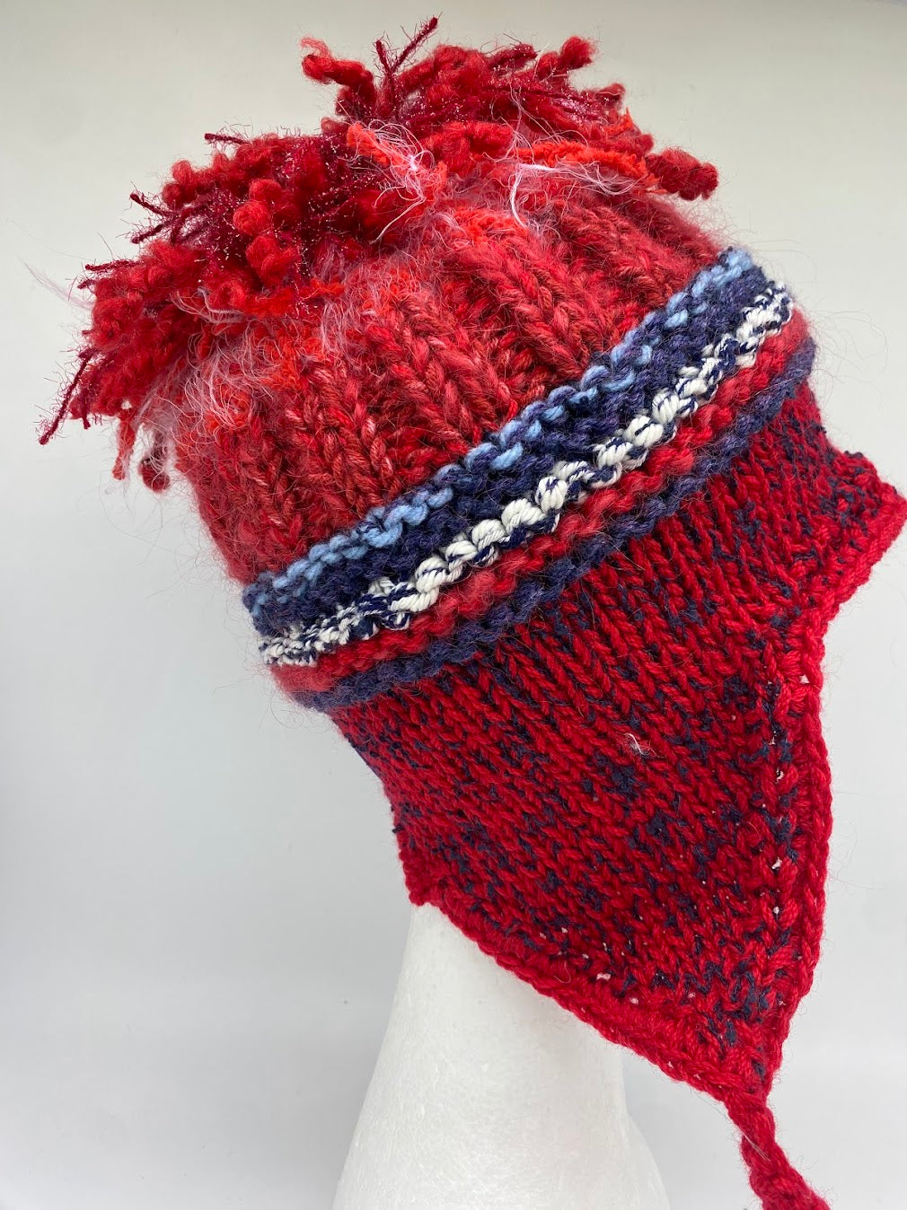 A Foof beanie is created using a 100% Australian wool as its main colour with a mixture of contemporary yarns. It features ear flaps, a band of garter stitch and rib.