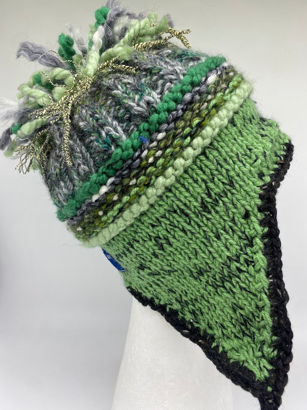 The top of the beanie incorporates the fun feature of contemporary yarns hanging from the crown.