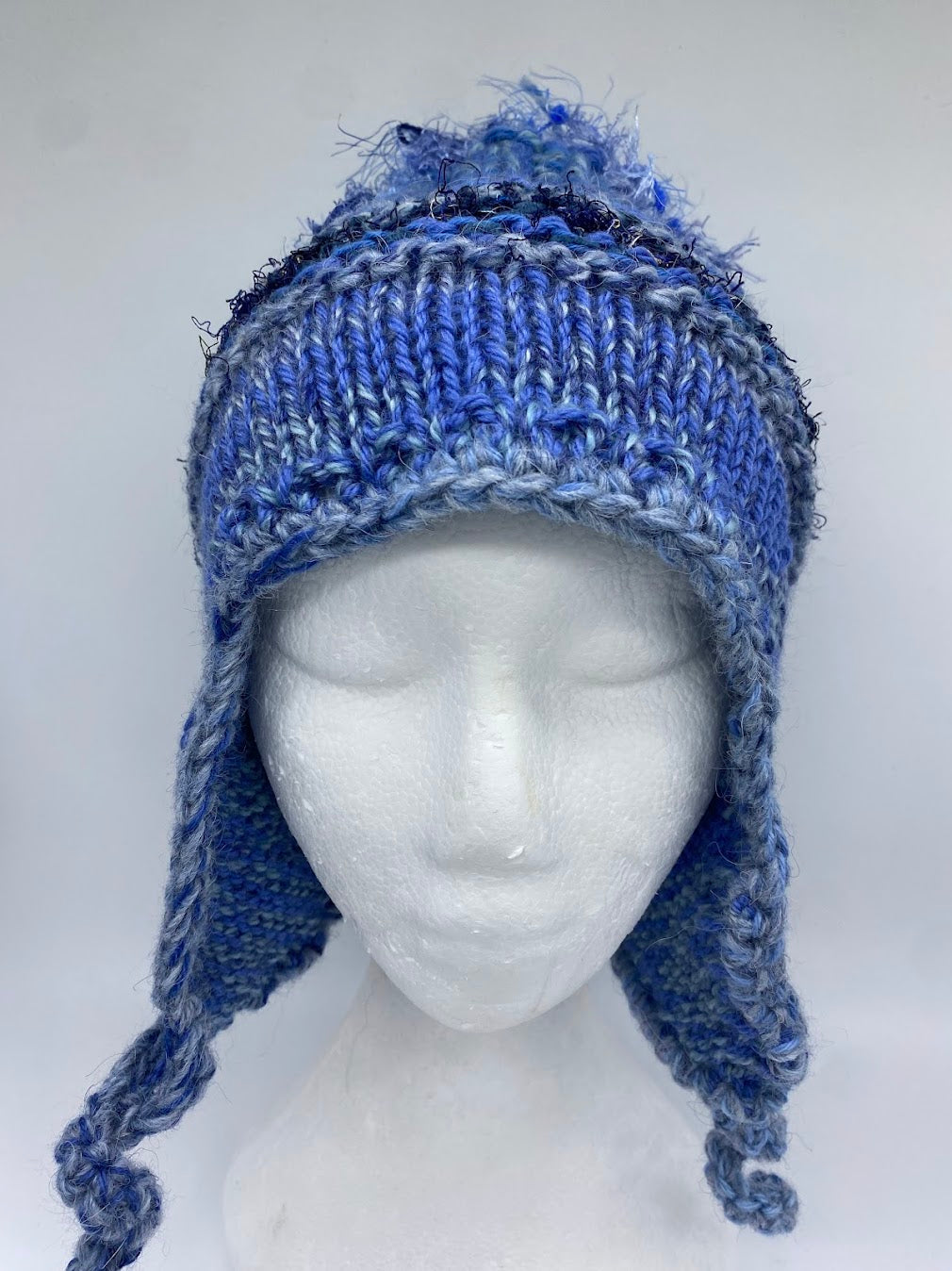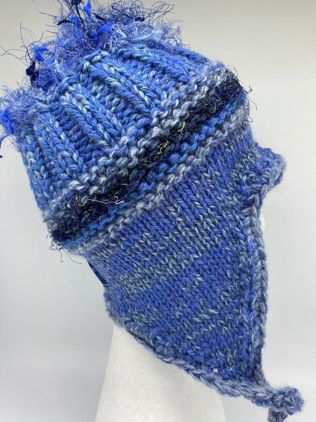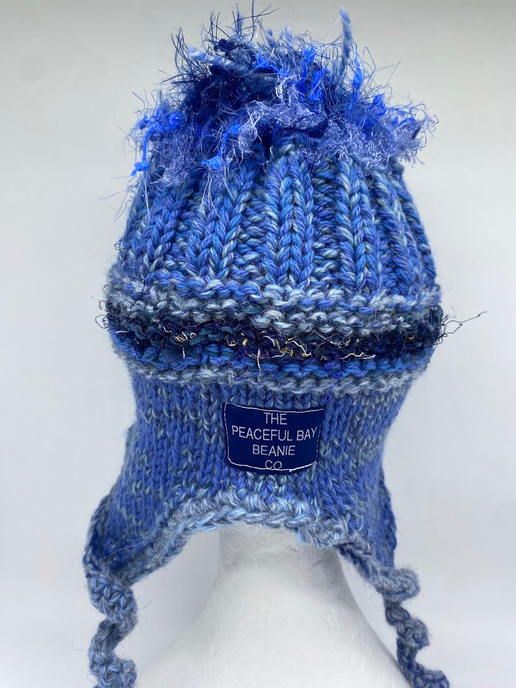 The top of the beanie incorporates the fun feature of contemporary yarns hanging from the crown.
