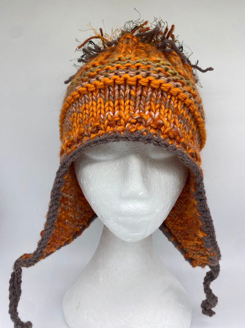 100% Australian wool (8ply) and contemporary yarns of various makeup. The 8 ply yarn is doubled for extra warmth and a delight to wear.