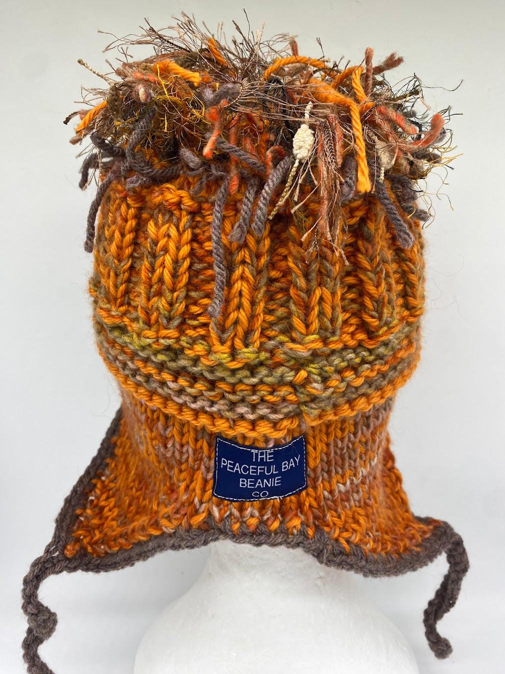 The top of the beanie incorporates the fun feature of contemporary yarns hanging from the crown.